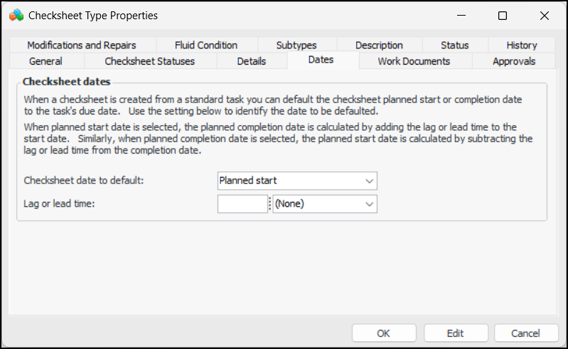 15. In the Lag or lead time boxes, you can specify how the checksheet’s other planned date is calculated. For example, if “Planned start” is selected and the lag time is 30 days, the planned completion date is set to 30 days after the planned start.