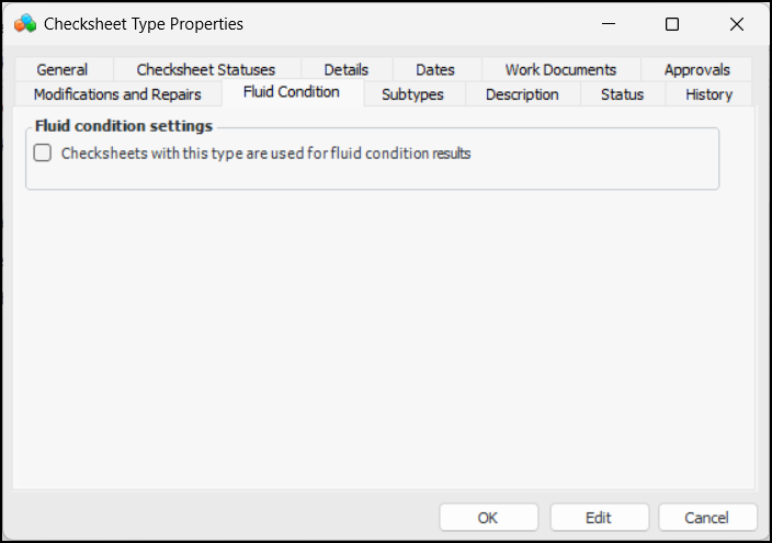 When this option is selected, the Fluid Types view is available in the Checksheet window. It lists the fluid types associated with the indicators.