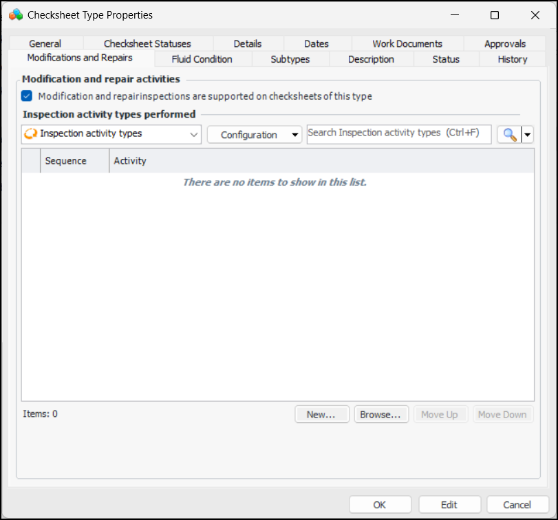 29. Modification and repair inspection is supported on checksheets of this type is selected by default, allowing you to add inspection activity types. Clear this option if the checksheet type is to be used for a different purpose.