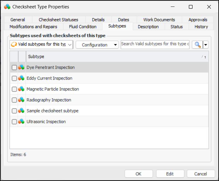 32. Select the Subtypes tab to select valid subtypes for this type of checksheet:Note: APM provides a sample checksheet subtype that you can use as a model for your custom subtypes. The sample subtype is listed in the Site window, Inspection Management view, Settings tab, Subtypes tab.