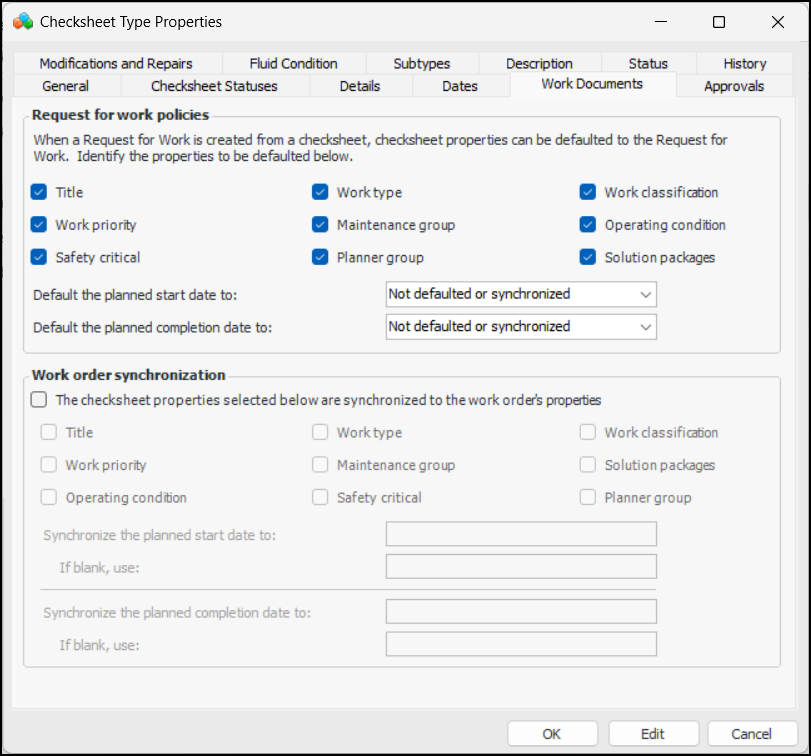 17. In the Request for work policies area, all of the properties are selected by default, which means that the checksheet properties are copied to the new request for work. You can deselect properties as needed and select the planned dates for the defaults.