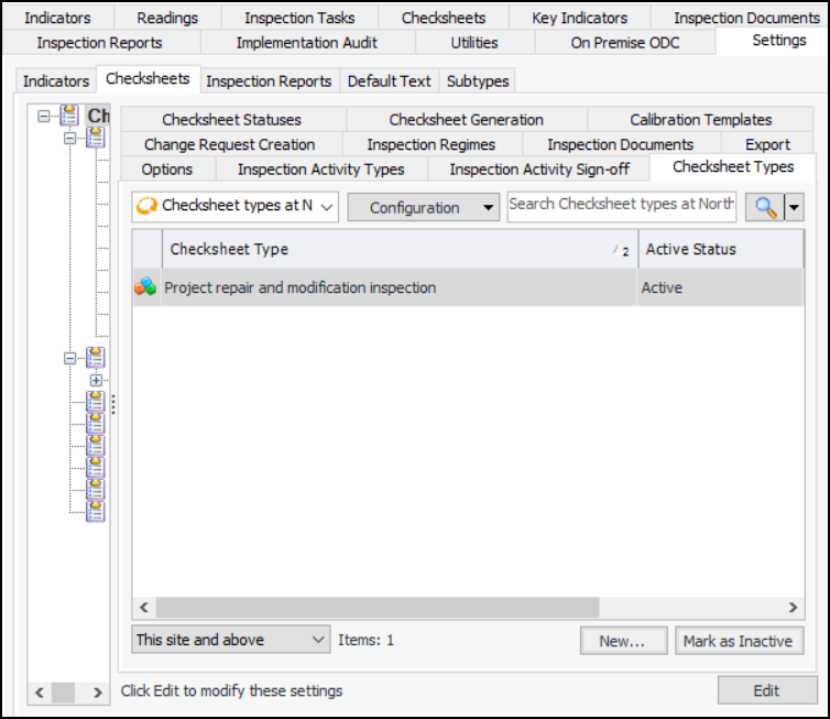 1. From the Site window, select the Inspection Management view, the Settings tab, and then the Checksheets tab. Select the Checksheet Settings node in the tree.Tip: You can also click the Administration menu, Inspection Management Settings, and then Checksheet Settings. The Checksheet Settings window appears.