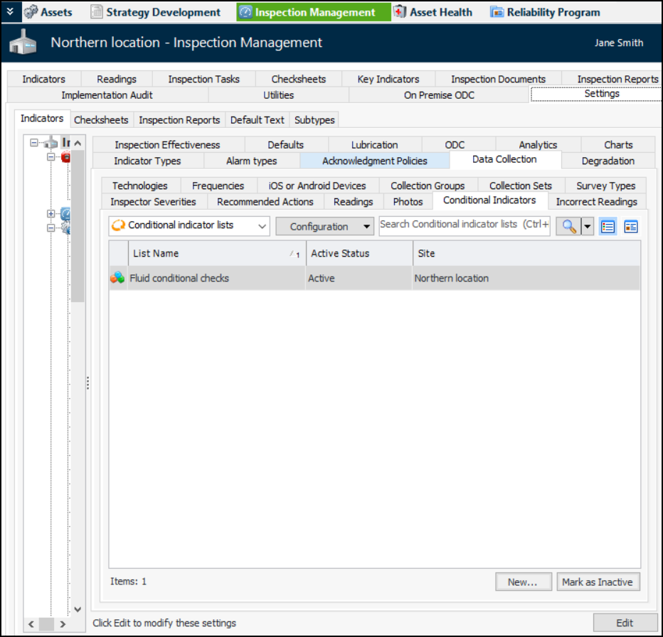2. Select the Data Collection tab and the Condition Indicators tab. This tab displays existing lists, if any. You can also mark a list as inactive to remove it from selection lists.