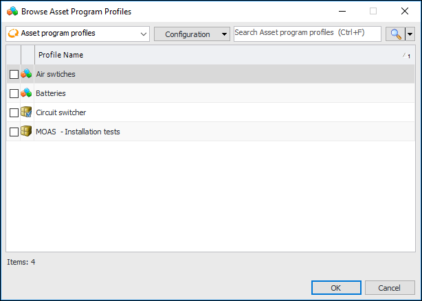 23. Click Browse in the Installation activities and inspections area. The Browse Asset Program Profiles dialog appears. For example: