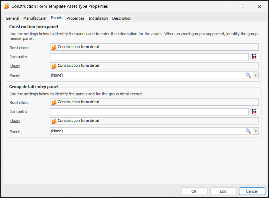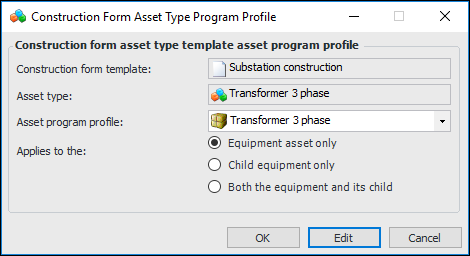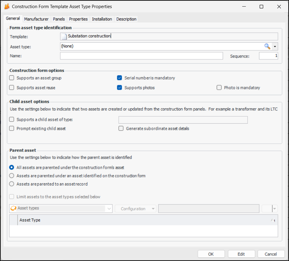 • The construction form asset – The asset that you select when creating a construction form will be the parent of assets of this type