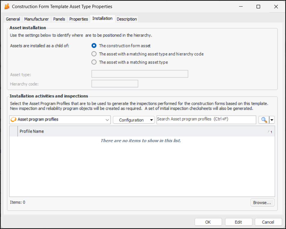 21. In the Construction Form Template Asset Type Properties window, select the Installation tab. For example: