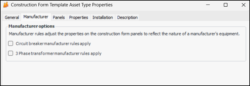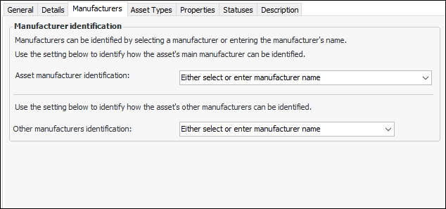 8. Select the Manufacturers tab to set options for identifying manufacturers for assets.