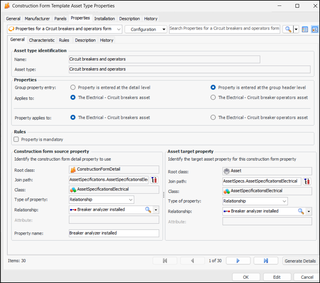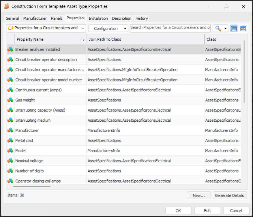 13. Select the Properties tab. Click Generate Details. APM populates the table with the properties from the asset type’s panel(s). Here is an example for the circuit breaker and operator asset type:The Properties tab provides several table configurations: