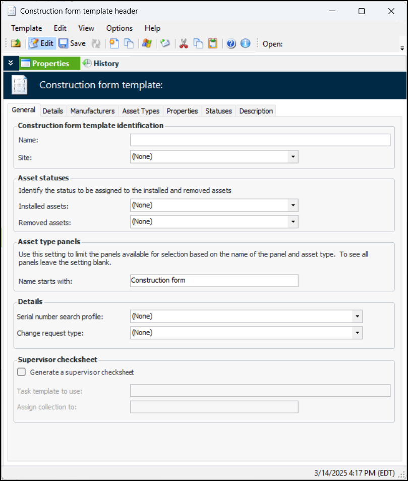 27. Tip: You can return to the Construction Form Template Asset Type Properties dialog in the future to view an audit history of the type. Select the History tab, which lists actions performed by event and data element.