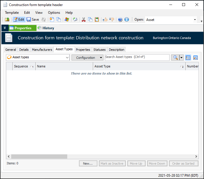 1. You can mark asset types as inactive until you are ready to include them in the template. You can change the order of asset types in the construction form using the Move Up and Move Down buttons. You can also update the sequence numbers by clicking Order as Sorted.