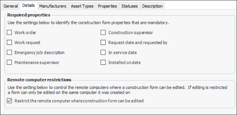 Note: Serial number is mandatory is enabled only when a serial number search profile has been selected for the construction form template.