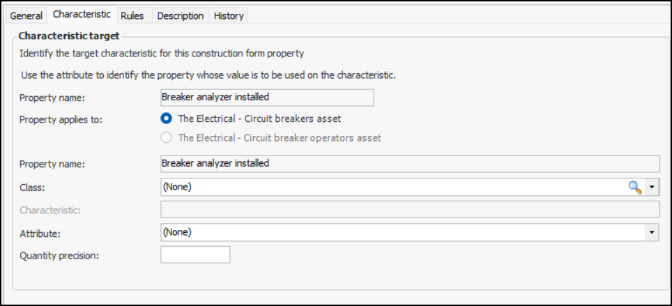 17. In the Characteristic target area, make any changes required for the target characteristic in the CMMS. You can select a characteristic class, characteristic, and attribute. For numeric data types, you can specify the number of decimal places allowed in the Quantity precision box.
