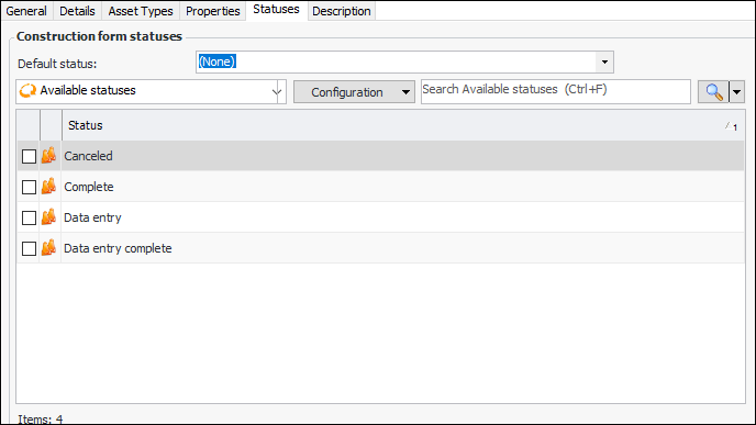 12. Select the Statuses tab. This tab lists the available construction form statuses. For example: