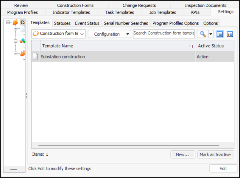 1. In the Site window, select the Construction Management view and the Settings tab. Select the Construction Management Settings node in the tree.Tip: You can also select the Administration menu and then Construction Management Settings. The Construction Management Settings dialog appears.