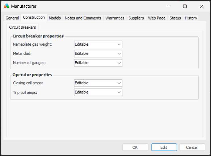 Manufacturer rules make it possible to remove unnecessary properties from construction forms, making them easier for users to complete. For example, in this form for a circuit breaker, the Nameplate gas weight, Metal clad, and Number of gauges properties are invisible. They could also be shown as read-only (irrelevant visible).To Set up Rules on Manufacturers