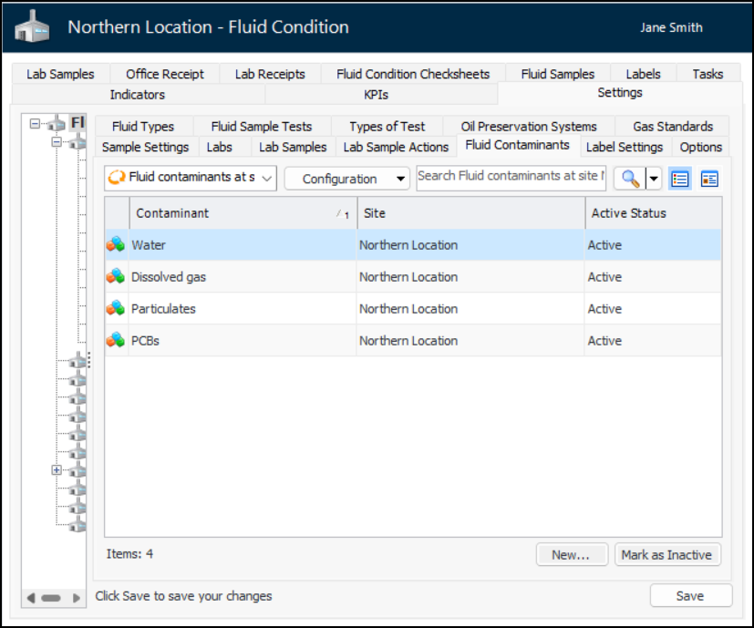 2. Select the Fluid Contaminants tab. This tab lists contaminants defined for the site.