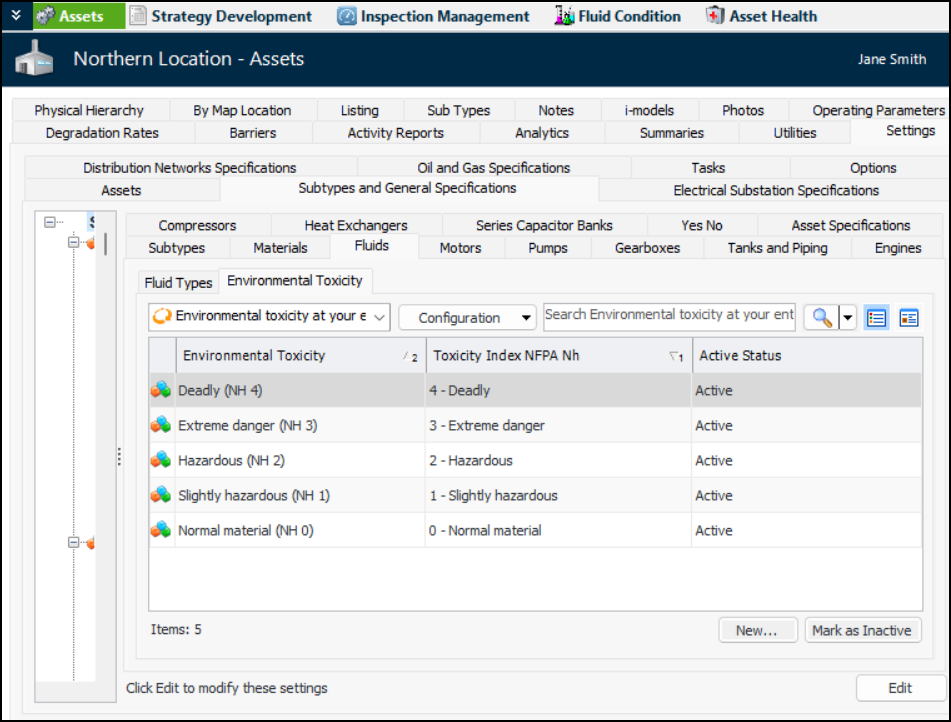 2. Click the Fluids tab and the Environmental Toxicity tab. This tab displays the toxicity values that have been defined for the enterprise. For example: