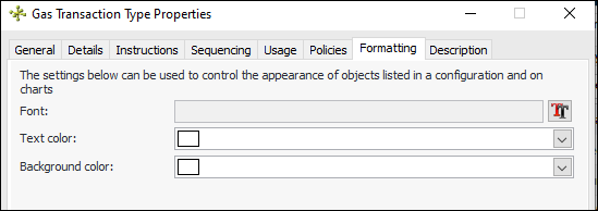 27. Select the Formatting tab to set the font, text color, and background color for transactions of this type. The formatting options determine the appearance of transactions in tables and charts.Description