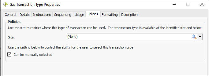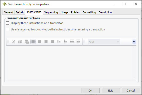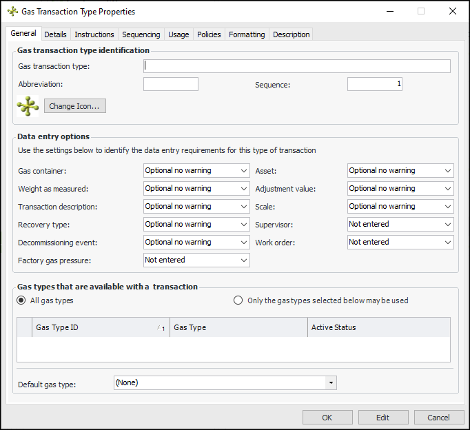 3. Click New. The Gas Transaction Type Properties dialog appears:General information