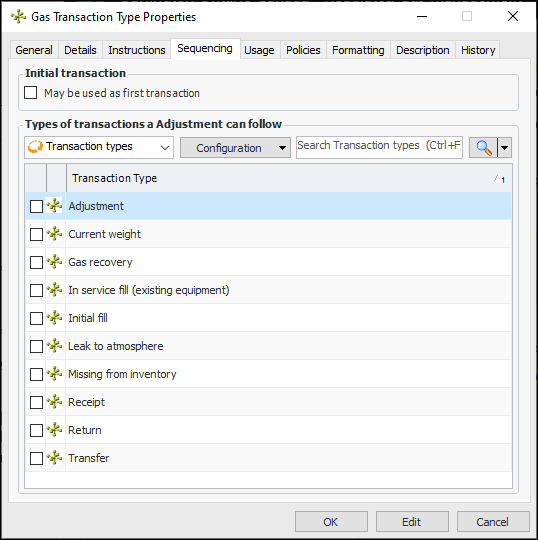 18. Select the Sequencing tab to specify the order in which transactions must be completed. This tab lists the transaction types that have been defined for the enterprise. For example:Usage