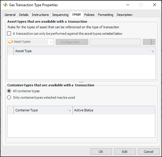 21. Select the Usage tab to specify the asset types and container types that are available to transactions for this type.