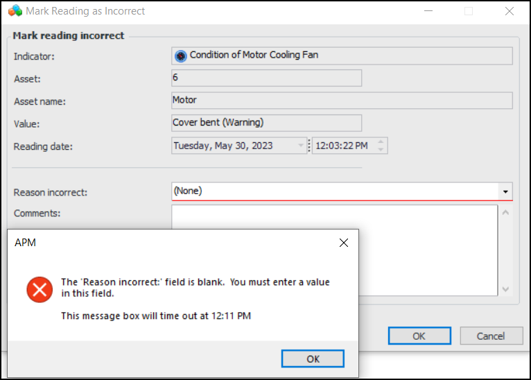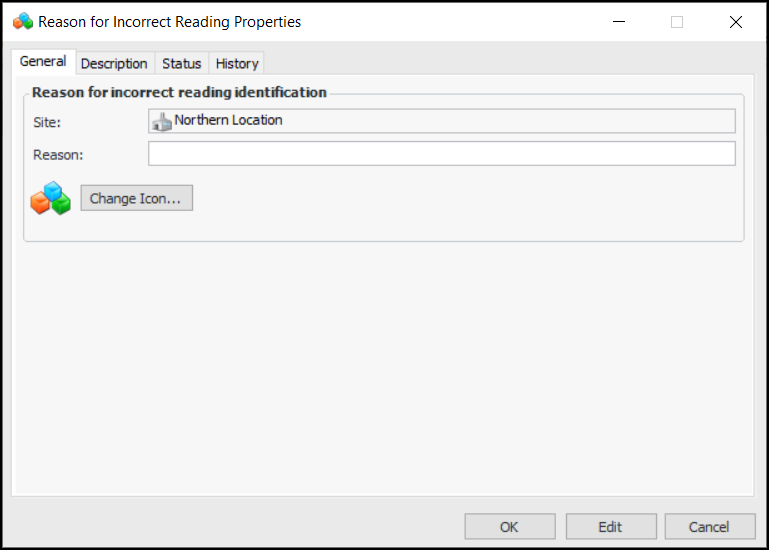 6. For each reason you wish to add, click New at the bottom of the Reasons for incorrect reading table. The Reason for Incorrect Reading Properties dialog appears: