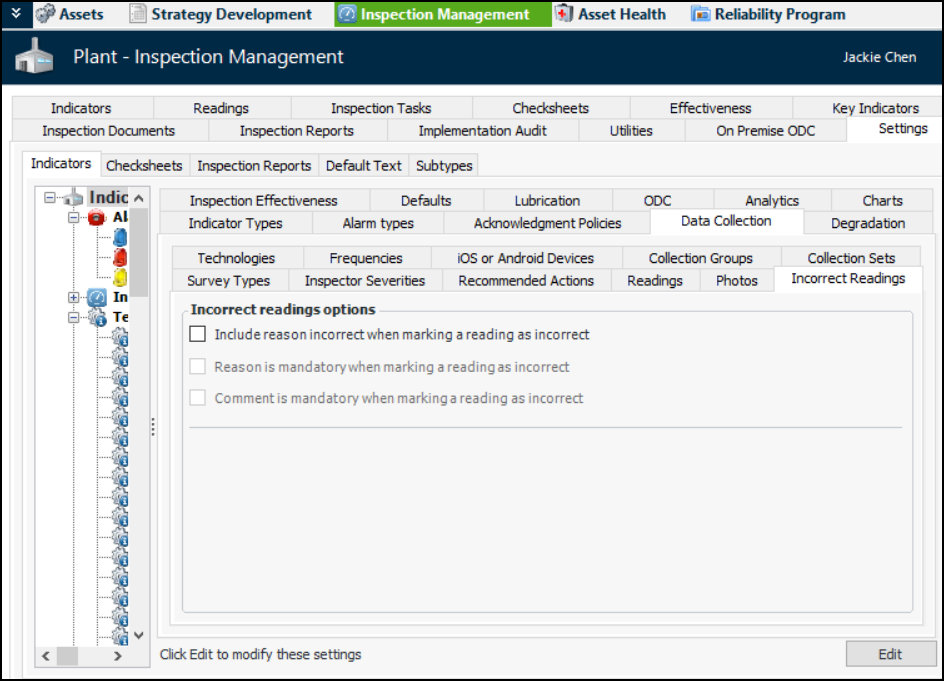 2. Select the Data Collection tab and the Incorrect Readings tab. This tab displays options and any existing reasons for incorrect readings.