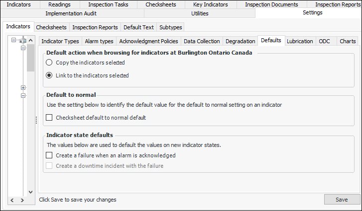 1. From the Site window, select the Inspection Management view, the Settings tab, and then the Indicators tab. Select the Indicator Settings node in the tree.Tip: You can also click the Administration menu, Inspection Management Settings, and then Indicator Management. The Indicator Settings window appears.