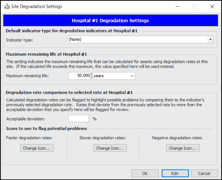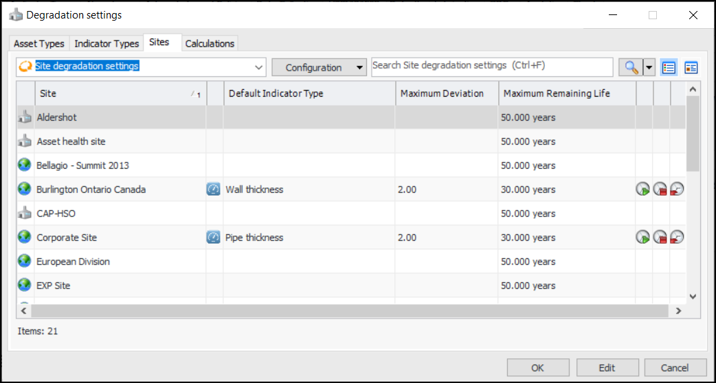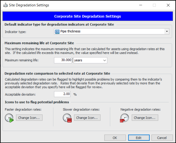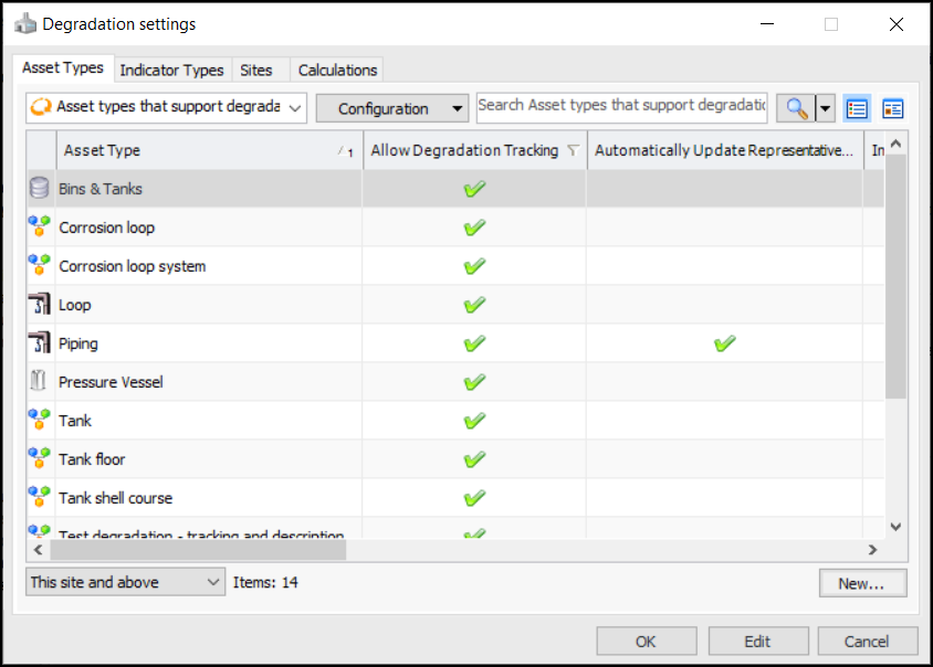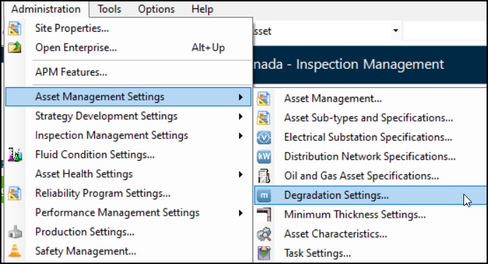 1. From a Site window, click the Administration menu, Asset Management Settings, and then Degradation Settings.The Asset Types tab displays all asset types that support degradation tracking. You can also select the “Asset types that do not support degradation tracking” configuration to add degradation settings. For more information, see **Setting up Asset Types.The Indicator Types tab displays all indicator types that support degradation tracking. You can also select the “Indicator types that do not support degradation tracking” configuration to add degradation settings. For more information, see **Setting up Indicator Types.Tip: You can also find degradation settings for the current site in the Inspection Management view, Settings tab, Indicators tab. Select the Indicator Settings node in the tree. Select the Degradation tab.