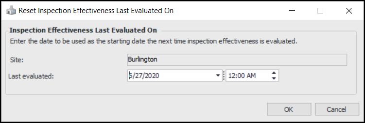 2. Click Reset. The Reset Inspection Effectiveness Last Evaluated On dialog appears. For example: