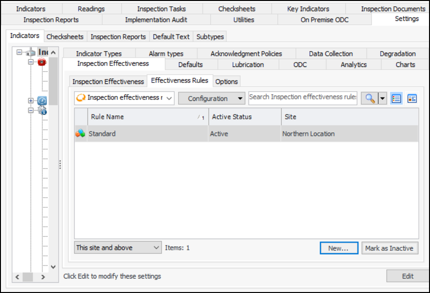 1. In the Site window, Inspection Management view, Settings tab, Inspection Effectiveness tab, select the Effectiveness Rules tab. For example: