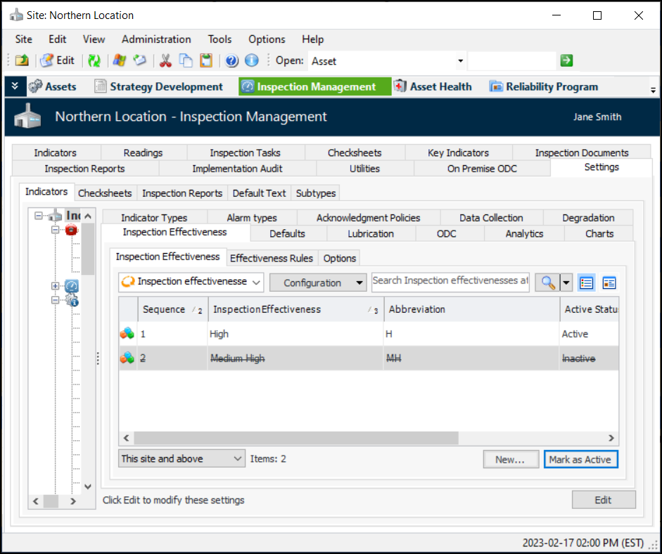 2. Select the Inspection Effectiveness tab. For example:Tip: You can mark a value as inactive to prevent it from being used. Select it in the table and click Mark as Inactive. When you wish to make the status available, select it in the table and click Mark as Active.
