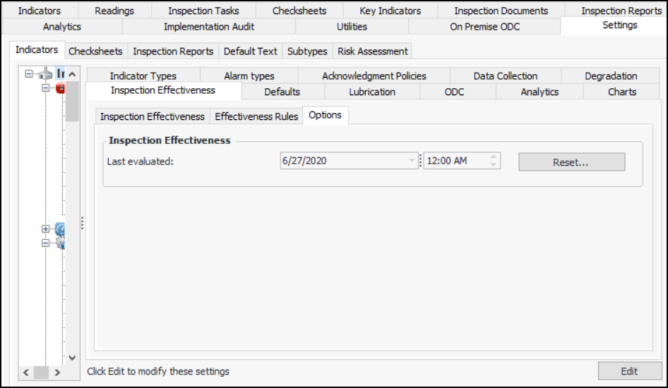 1. In the Site window, Inspection Management view, Settings tab, Inspection Effectiveness tab, select the Options tab. For example: