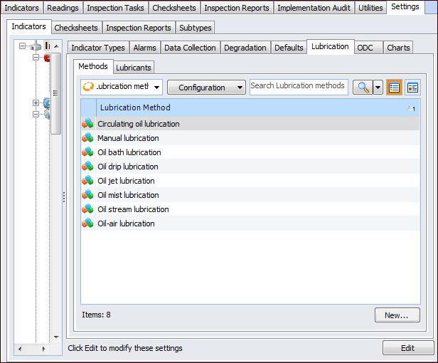 2. Select the Lubrication tab and then the Methods tab. This tab displays all lubrication methods for the site.