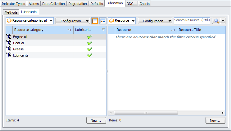 2. Select the Lubrication tab and then the Lubricants tab. This tab lists all of the enterprise’s lubricant resource categories in a table on the left.