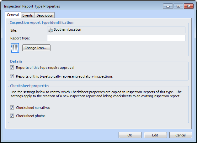 3. For each report type that you wish to create, click New. The Inspection Report Type Properties dialog appears.