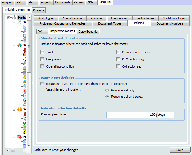 1. From the Site window, select the Reliability Program view and the Settings tab. Select the Reliability Program tab and the Reliability program settings node in the tree.Tip: You can also select the Administration menu and Reliability Program Settings. The Reliability Program Settings dialog appears.