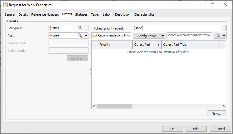 • When recommendations from events are supported, the Events tab is available, where you can add events and select part groups, parts, damage codes, and activity codes. Here is an example from a request for work created from scratch: