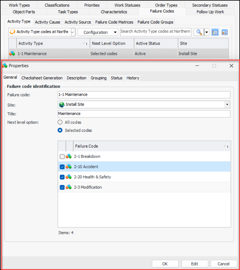 • You can set up your work types to specify whether a failure code is mandatory on a request for work. In the Work Type and Site Settings dialog, select the Requests or Trigger Requests tab and then the Mandatory Properties tab. Select the failure code levels that are mandatory. For example: