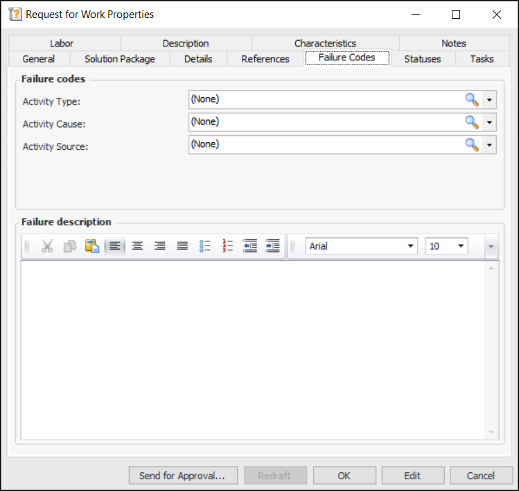 • When failure codes are supported, the Failure Codes tab is available, where you can select failure code values and add a description. Here is an example from a request for work created from scratch:Interop Work Requests and Interop Work Orders