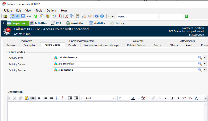 In the Failure or Anomaly window, the Properties view contains a tab labeled either Events or Failure Codes, depending on the Failure code type setting in the site’s interoperability profile.When you reference a failure mode on the General tab, the failure mode’s failure codes and description are copied to the Failure Codes tab. You can also select codes and add a failure description. For example:Solution Packages