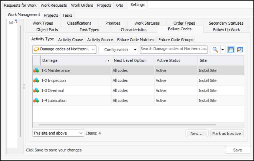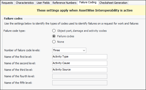 • In the Site Interoperability Profile window, select the Work Management and Failure Coding tabs. In the Failure code type options, select Failure codes. The tab changes as follows:Tip: To view the codes, open the Site window, select the Work Management view, Settings, and Failure Codes tabs. You will see one tab for each of the levels you added in the site profile. For example: