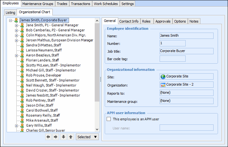 3. In the Top of organizational chart list, select the employee who will appear at the top of the organization. Browse to open the Employee Selector dialog.Tip: You can also add employees to APM using the selector dialog. Click the Organizational Chart tab to view the hierarchy.To Modify the Organizational Chart