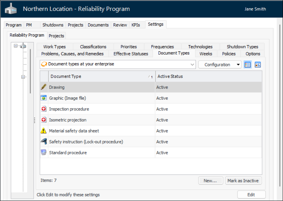 1. From the Site window, select the Reliability Program view and the Settings tab. Select the Reliability Program tab and the Reliability program settings node in the tree.Tip: You can also select the Administration menu and Reliability Program Settings. The Reliability Program Settings dialog appears.