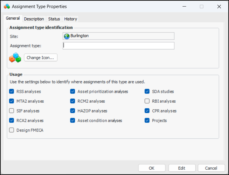 3. For each assignment type that you wish to create, click New. The Assignment Type Properties dialog is displayed: