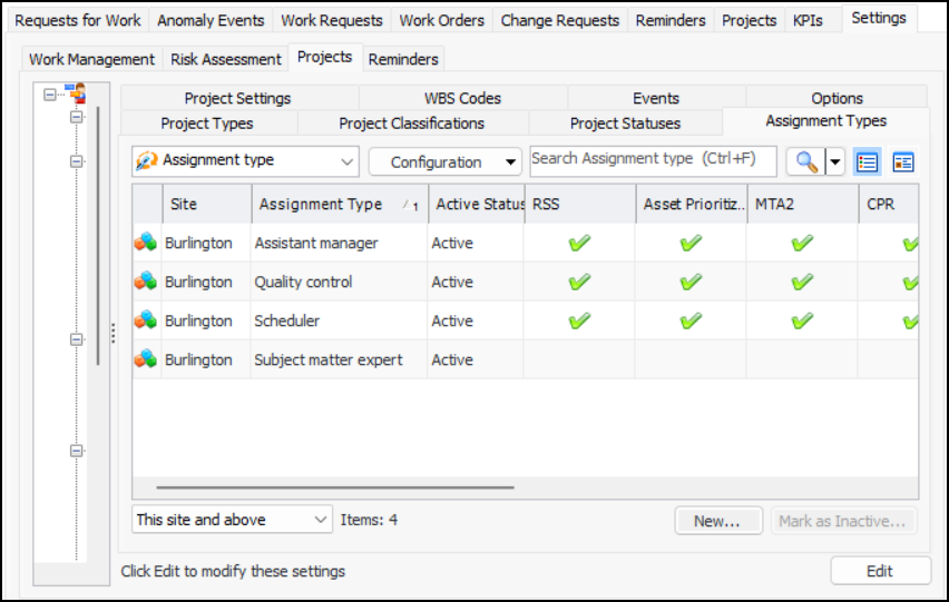 1. From the Site window, select the Work Management view and the Settings tab. Select the Projects tab and the Project management settings node in the tree.Tip: You can also work with project settings in the Strategy Development, Reliability Program, or Performance Management views. Select the Settings tab and then the Projects tab.