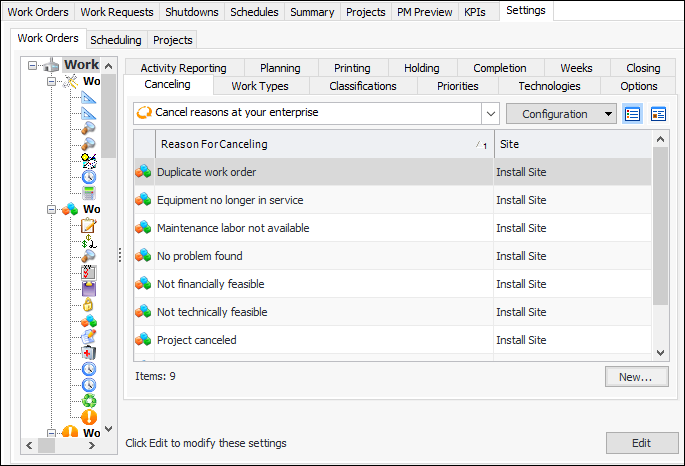 1. From the Site window, select the Work Management view and the Settings tab. Select the Work Orders tab and the Work management settings node in the tree.Tip: You can also select the Administration menu and then Work Management Settings. The Work Management Settings dialog appears.