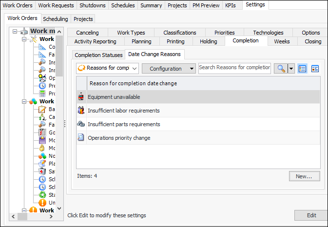 1. From the Site window, select the Work Management view and the Settings tab. Select the Work Orders tab and the Work management settings node in the tree.Tip: You can also select the Administration menu and then Work Management Settings. The Work Management Settings dialog appears.