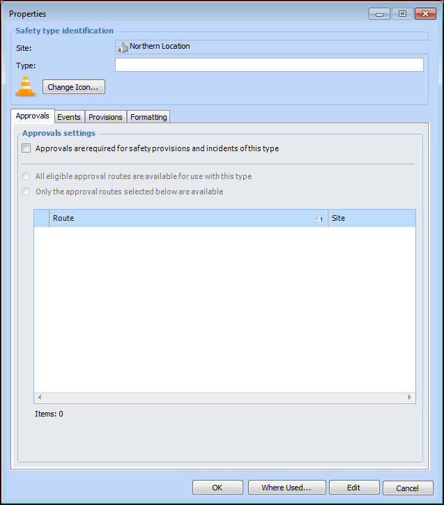 5. If objects with this type are to be sent for approval, click Approvals are required.