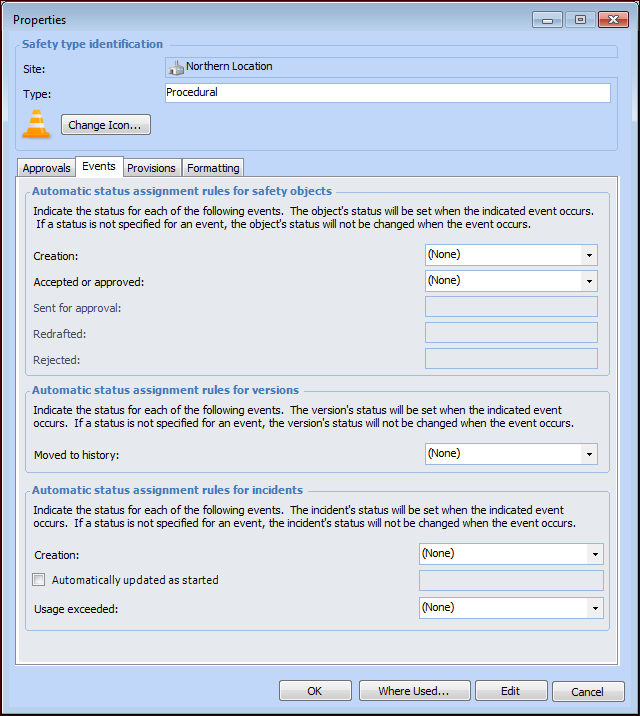 This topic explains how to set up safety types. See Safety Statuses and Types for examples of events and their statuses. For information about setting up statuses, see Setting up Safety Statuses.To Set up a Safety Type